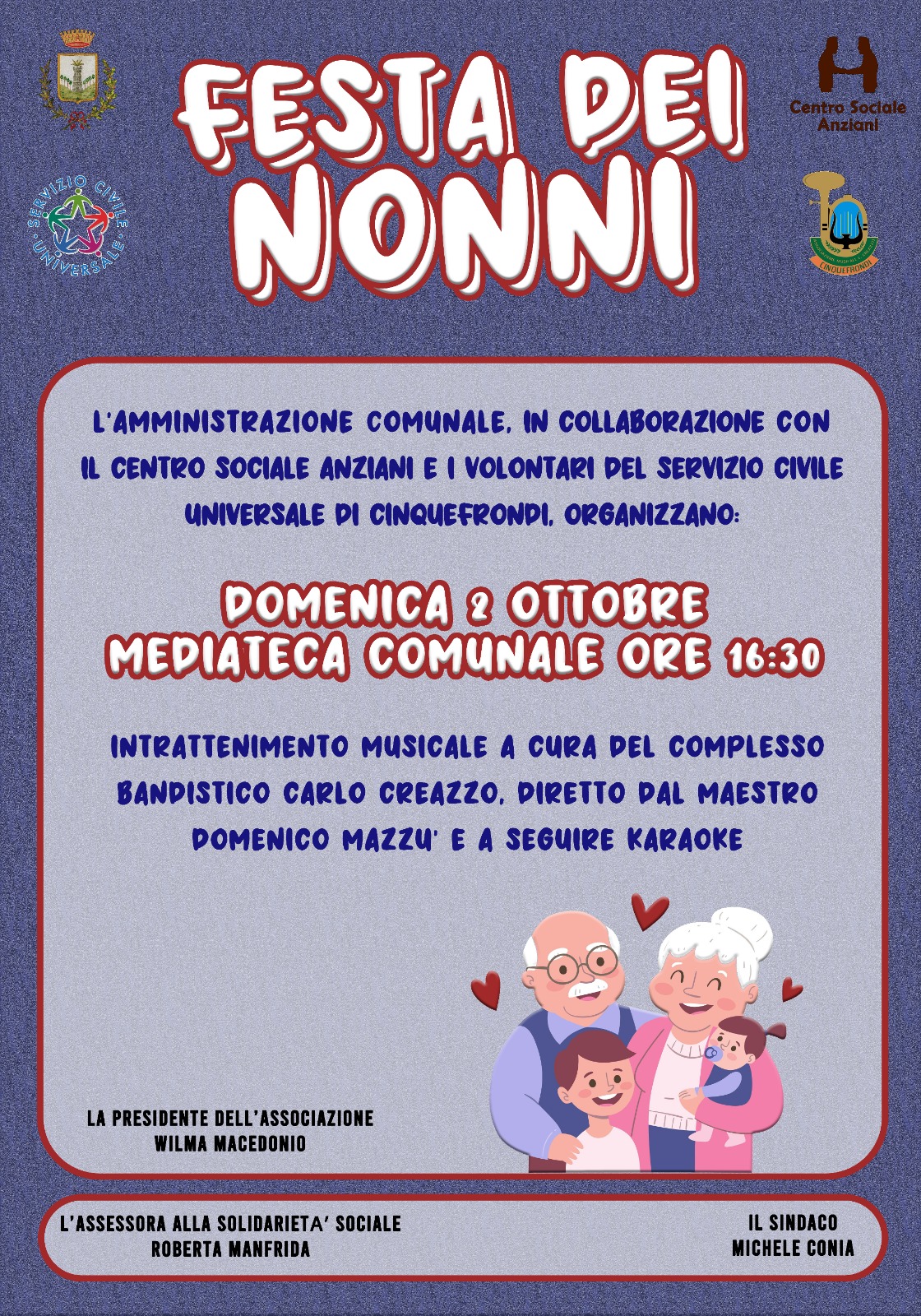 “Una comunità per esistere deve essere basata su un valore fondamentale che è inestimabile: la memoria storica. Quale figura nella società rappresenta al meglio questo concetto se non i Nonni? Come ogni anno il 2 Ottobre si celebra la Giornata Internazionale dei Nonni, e naturalmente il Comune di Cinquefrondi, rappresentato dall’Amministrazione Comunale, non può mancare questo appuntamento. Per il quinto anno, infatti, il Centro Sociale Anziani coadiuvato dall’importante collaborazione dei Volontari del Servizio Civile Universale di Cinquefrondi e dell’assoluto sostegno degli Assessori e del Sindaco, organizzano una festa dedicata ai nonni“, è quanto affermano il sindaco Michele Conia e l’assessore Roberta Manfrida.