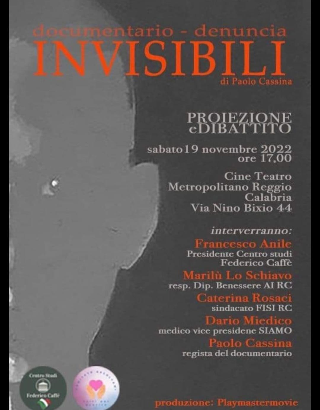 Sabato 19 novembre 2022 ore 17.00 al Cine Teatro Metropolitano DLF di Reggio Calabria, il Centro Studi Federico Caffè ha organizzato un incontro culturale che prevede la proiezione di “Invisibili”, un documentario-denuncia sulle reazioni avverse al vaccino covid-19, prodotto da Playmastermovie e diretto da Paolo Cassina. Il film contiene interviste ai danneggiati da “vaccino” anticovid e a professionisti del settore, vuole fornire una testimonianza diretta di una serie di azioni messe in atto dal governo italiano che appaiono in aperto contrasto con la Costituzione. Azioni che di fatto hanno messo sotto ricatto milioni di italiani, in nome di una terapia sperimentale rivelatasi nel tempo non efficace e in molti casi dannosa, lontana da quelle promesse ed illusioni che hanno creato nel tempo, senza alcun fondamento scientifico e/o empirico.