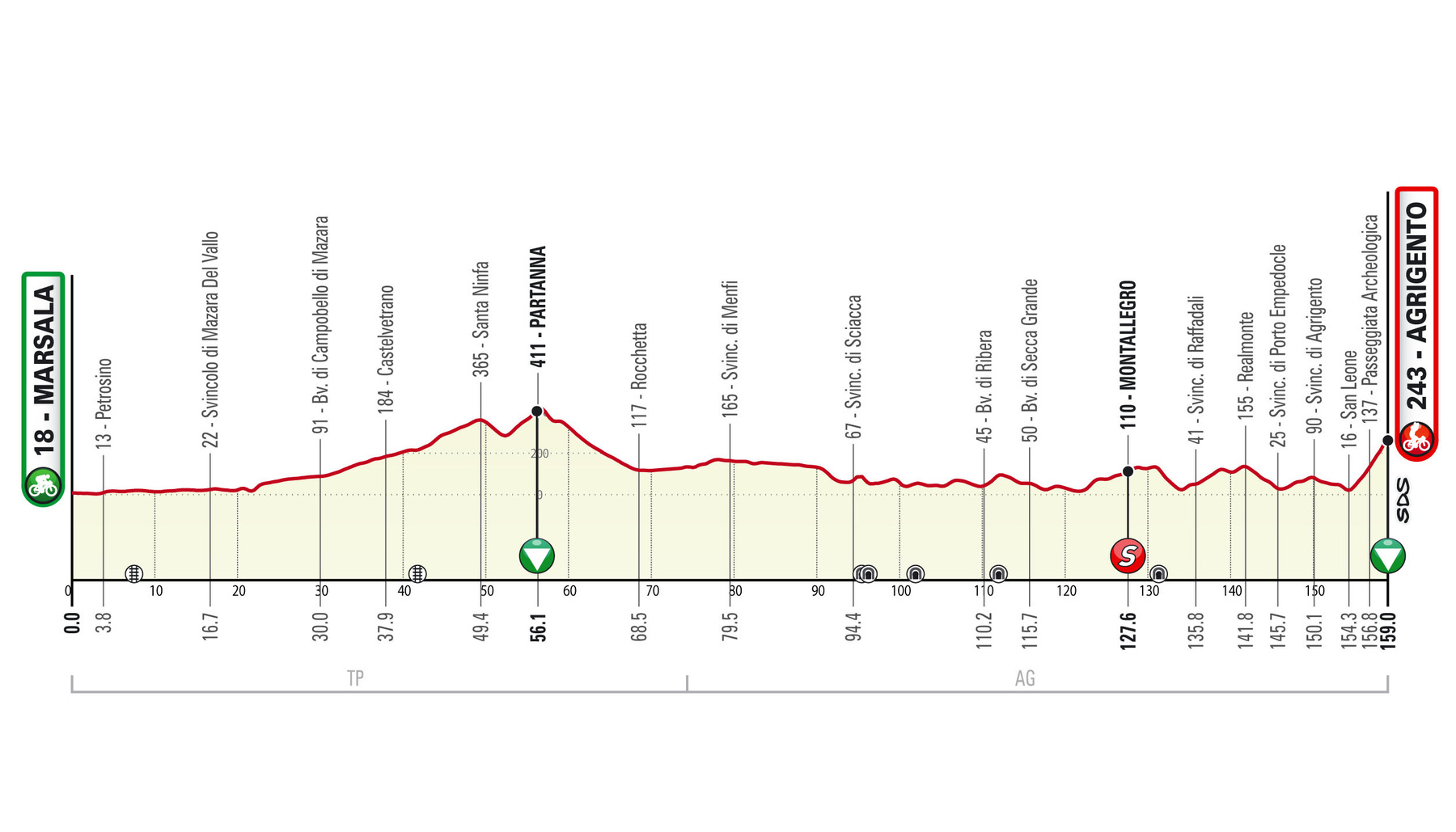 Tappa divisa in due parti. La prima parte piuttosto articolata in saliscendi e numerose curve nell’entroterra trapanese e nella Valle del Belice. Seconda parte quasi interamente su strade a scorrimento veloce e senza veri attraversamenti di centri urbani. Lasciata Marsala si procede per saliscendi attraverso Castelvetrano, Santa Ninfa e Partanna fino a entrare nella strada a scorrimento veloce che, lungo la costa e con alcuni saliscendi con pendenze moderate, porta a 4 km dall’arrivo all’ingresso della Valle dei Templi ai piedi di Agrigento.