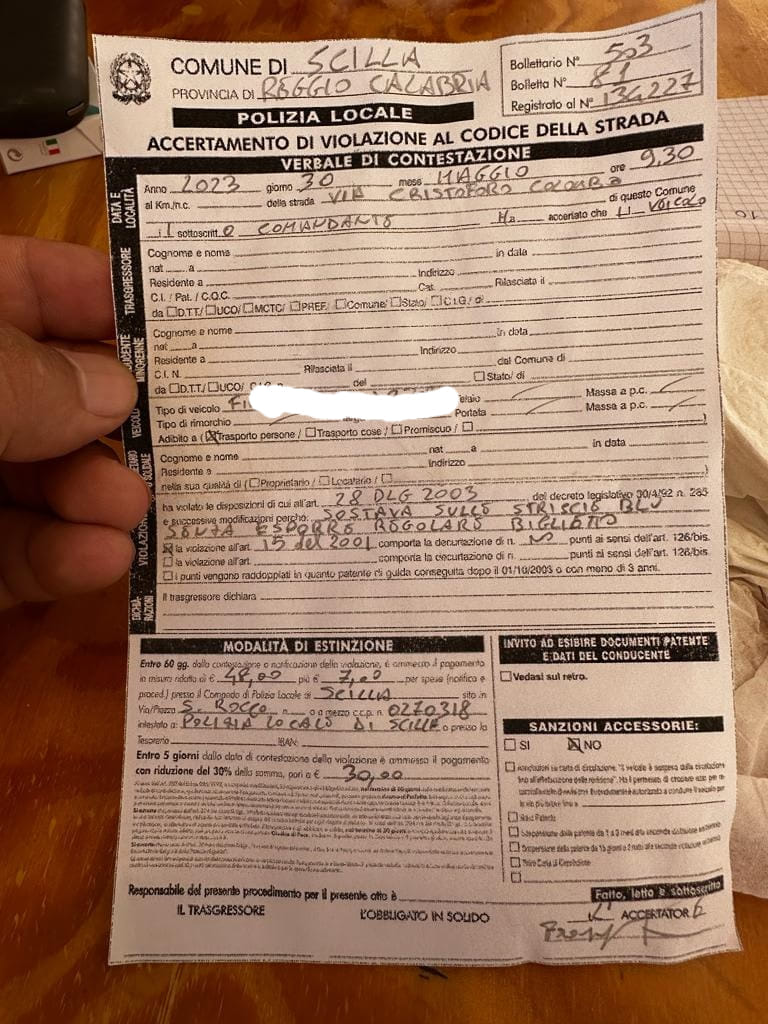 La denuncia arriva direttamente dai profili social del Comandante dei Vigili di Scilla Barbara Latella e riguarda alcune finte multe affisse alle vetture presenti nel Comune. “Mi è appena stato segnalato questo fac-simile di verbale di accertamento lasciato su un veicolo in sosta che reca l’intestazione del Comune di Scilla asseritamente redatto da me Comandante con indicazione di un conto corrente postale su cui pagare la presunta sanzione”. Una truffa studiata a tavolino e completa di dettagli, dal marchio del Comune di Scilla all’indicazione dell’articolo del codice della strada violato, dal costo della sanzione fino al famigerato “sconto” se si paga entro i primi cinque giorni.
