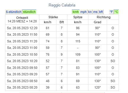 Clamoroso il dato del vento: alle 10:50 di questa mattina la stazione meteo ufficiale dell’ENAV collocata all’Aeroporto dello Stretto ha registrato una raffica di 109km/h, degna degli uragani tropicali. Nuova clamorosa raffica di 115km/h, dopo trenta minuti, alle 11:20.