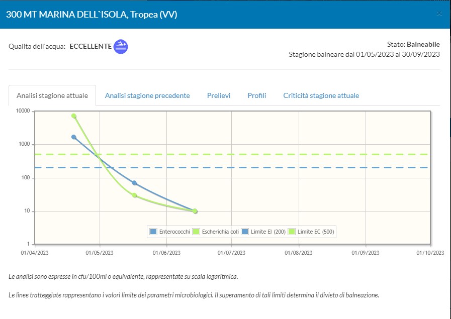 Tropea, perla del Tirreno, si conferma ancora una volta come meta turistica d’eccellenza per la stagione estiva 2023. Il lavoro di sinergia del Comune con gli enti preposti, hanno permesso lo sviluppo di un turismo di qualità e sempre aggiornato, al passo con i tempi ma che affonda le radici nella tradizione e nei marcatori identitari. L’acquisizione della Bandiera Blu è la ciliegina sulla torta per questo piccolo, ma internazionale, borgo calabrese, conquistata anche per la qualità delle acque di balneazione, oltre ai servizi recettivi deputati all’accoglienza. A confermare l’eccellenza del mare di Tropea ci hanno pensato i dati Arpacal: nei mesi che vanno da aprile a giugno 2023 infatti, confermano una qualità eccellente della acque delle tre spiagge della Città di Tropea, come riportati nei grafici che seguono.