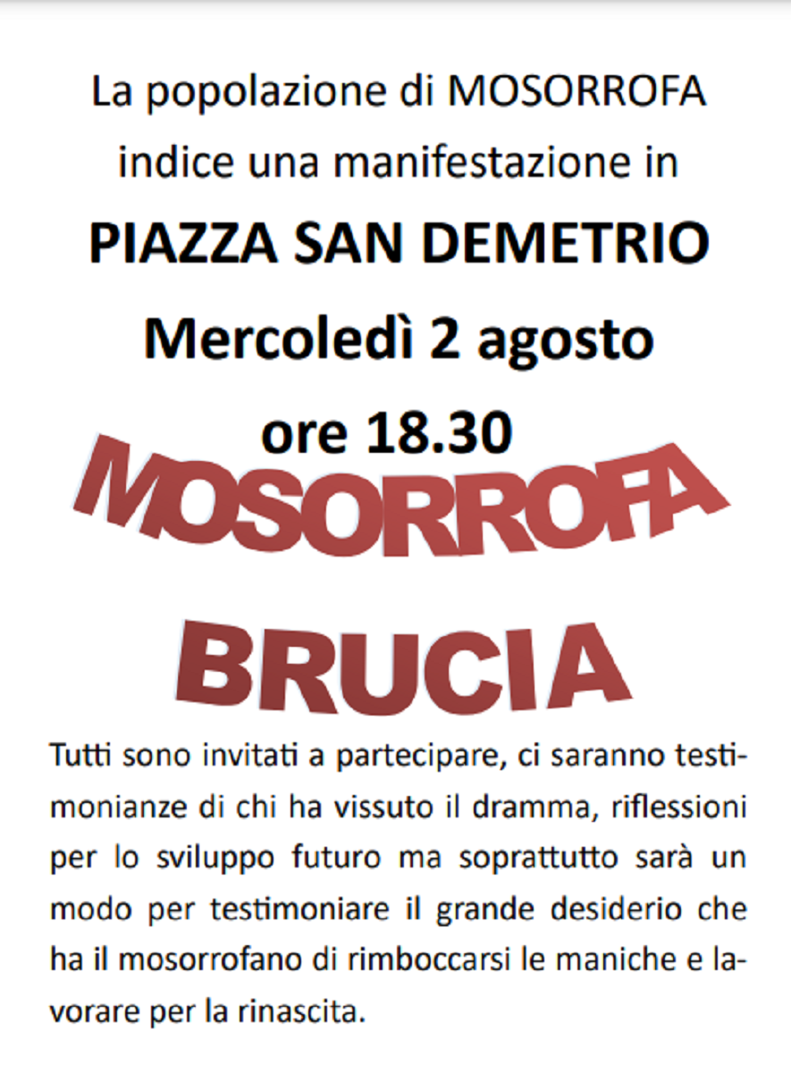“Il sindaco f.f. Brunetti ha dato solidarietà a tutta la popolazione e ha chiesto, con voto unanime di maggioranza e minoranza, lo stato di calamità naturale. Mosorrofa non si accontenta della solidarietà, sono anni che subisce soprusi e torti da tutte le amministrazioni comunali che si sono succedute, vuole rinascere, ridiventare la terra rigogliosa e bella di un tempo quando dai paesi vicini e a volte anche dalla città venivano a vedere il cinema, a gustare un ottimo gelato e a fare le gite fuori porta. Pertanto, la popolazione ha deciso di indire una manifestazione in Piazza San Demetrio a Mosorrofa mercoledì 2 agosto alle ore 18.30. Tutti sono invitati a partecipare, ci saranno testimonianze di chi ha vissuto il dramma, riflessioni per lo sviluppo futuro ma soprattutto sarà un modo per testimoniare il grande desiderio che ha il mosorrofano di rimboccarsi le maniche e lavorare per la rinascita. Chiediamo a tutte le autorità, a tutti i livelli, di mettersi una mano sulla coscienza e di contribuire fattivamente con atti amministrativi seri e puntuali a questa rinascita. A testimoniare la voglia di rinascita e lo spirito indomito dei mosorrofani ci ha pensato stamattina la Banda Musicale del Paese che ha fatto il giro dei luoghi interessati dal rogo facendo dei mini concerti”, conclude la nota.