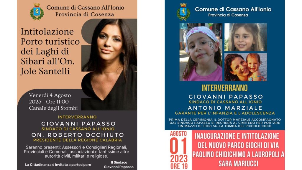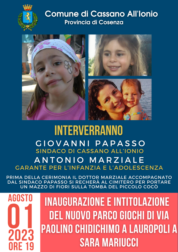 Doppia intitolazione in arrivo per altrettante opere nel Comune di Cassano. L’amministrazione comunale guidata dal sindaco Giovanni Papasso ha organizzato per martedì 1 agosto alle ore 19.00 la manifestazione di inaugurazione e intitolazione a “Sara Mariucci” del nuovo parco giochi di via Paolino Chidichimo.