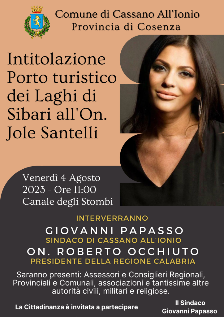 Tre giorni dopo, venerdì 4 agosto, invece, alle ore 11.00, alla presenza di assessori e consiglieri regionali, provinciali e comunali, autorità civili, militari e religiose, avrà luogo la manifestazione di intitolazione all’Onorevole “Jole Santelli”, Parlamentare, Sottosegretaria e Presidente della Regione Calabria, del Porto turistico dei Laghi di Sibari. All’iniziativa, fortemente voluta dal sindaco Giovanni Papasso e dalla giunta da lui guidata, sarà presente il Presidente della Regione Calabria Roberto Occhiuto. “L’On.le Jole Santelli – ha spiegato il sindaco Giovanni Papasso – prematuramente scomparsa, per onorare e perpetuare la memoria della prima donna Presidente della Regione Calabria, ma già Parlamentare e Sottosegretaria, che ha amato e onorato la sua terra, impegnandosi con tenacia e coraggio nello svolgimento delle sue funzioni fino alla fine dei sui giorni, per promuovere una nuova immagine della Calabria intera”. Prima donna eletta presidente della Regione Calabria è deceduta improvvisamente, all’età di 51 anni, il 15 ottobre 2020 (otto mesi dopo il suo insediamento a Palazzo degli Itali) nella sua casa di Cosenza, a causa di un male incurabile.