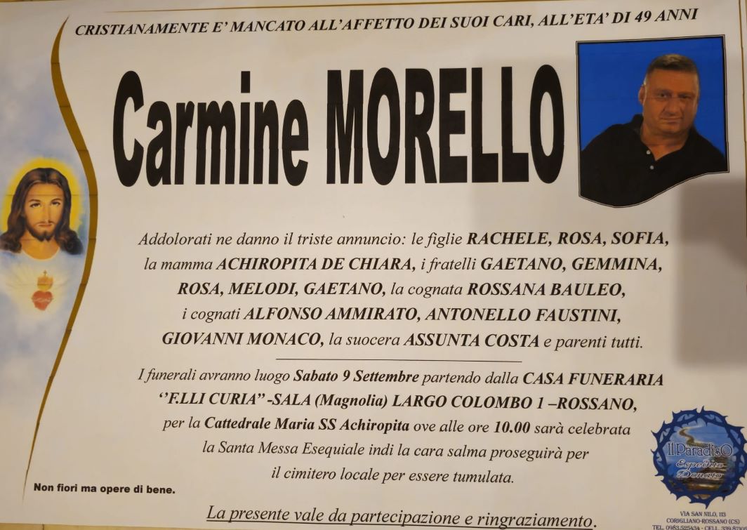 Il mistero della morte di Carmine Morello, ritrovato nelle campagne rossanesi a un mese dalla sua scomparsa, comincia lentamente a districarsi: ieri è stata eseguita l’autopsia sul cadavere del 49enne, in avanzato stato di decomposizione, i cui risultati hanno permesso di rilevare importanti dettagli sulla sua morte. Confermata quindi l’ipotesi di omicidio: Carmine Morello è stato raggiunto da colpi d’arma, nello specifico una pistola, che lo hanno freddato il medesimo giorno della sua scomparsa. Non sono ancora stati resi noti i dati ufficiali, ma emerge che la vittima sia stata sparata all’altezza della testa.
