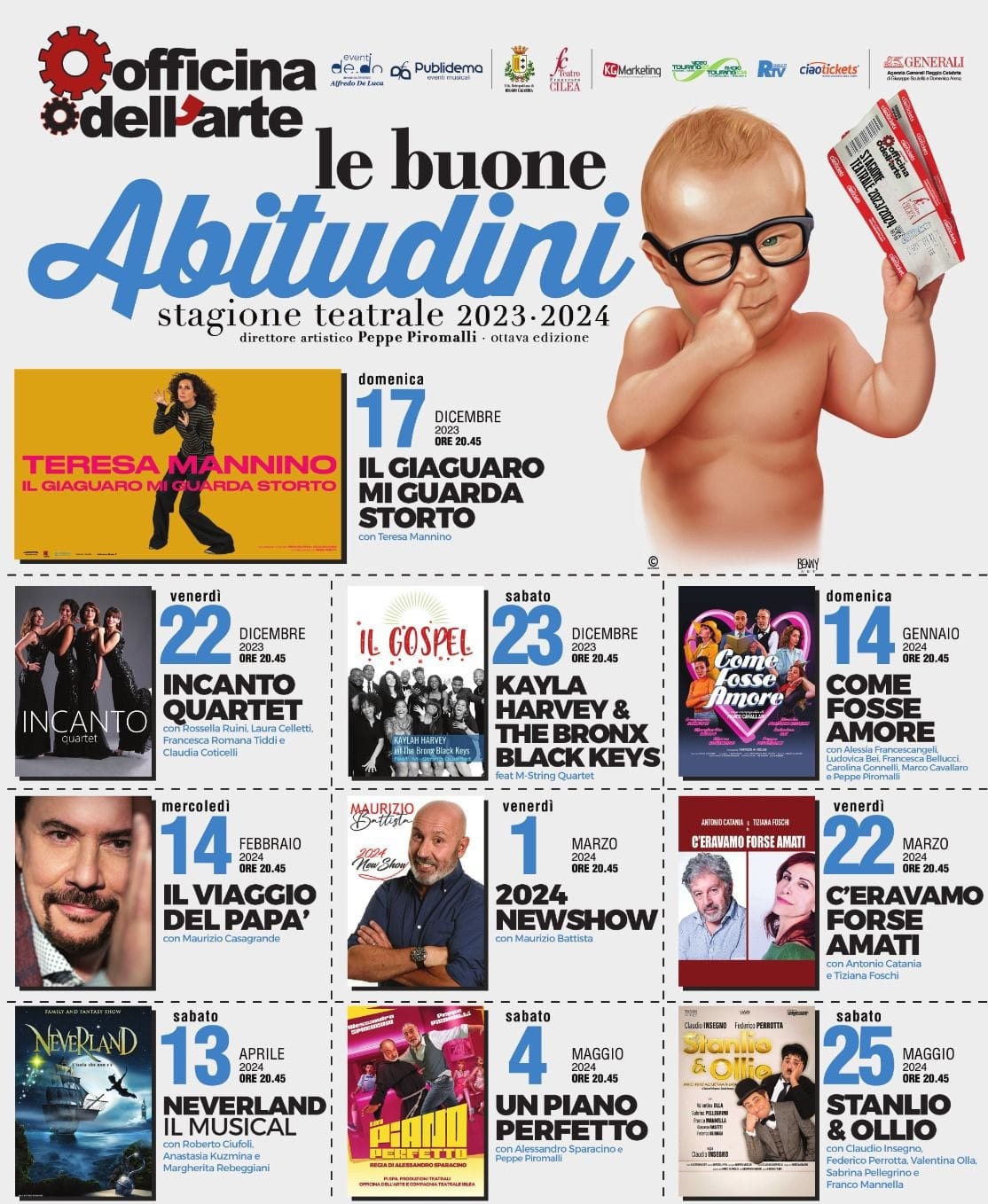 “Il 14 Gennaio l’esilarante commedia “Come fosse amore” di e con Marco Cavallaro, il 14 Febbraio la commedia “Il viaggio del papà” con il vulcanico Maurizio Casagrande, l’uno Marzo torna il comico romano Maurizio Battista con “2024 Newshow”, protagonista anche della serata voluta dalla Città Metropolitana il 27 Luglio al Castello Aragonese, il 22 Marzo la pièce “C’eravamo tanto amati” con Antonio Catania e Tiziana Foschi, il 13 Aprile il musical “Neverland”, il 4 Maggio “Un piano perfetto” con l’attore siciliano Alessandro Sparacino (e lo stesso Piromalli) e chiuderemo il 25 Maggio con la parodia “Stanlio & Ollio” e gli attori Claudio Insegno, Federico Perrotta, Valentina Olla, Sabrina Pellegrino e Franco Mannella”, conclude Piromalli.