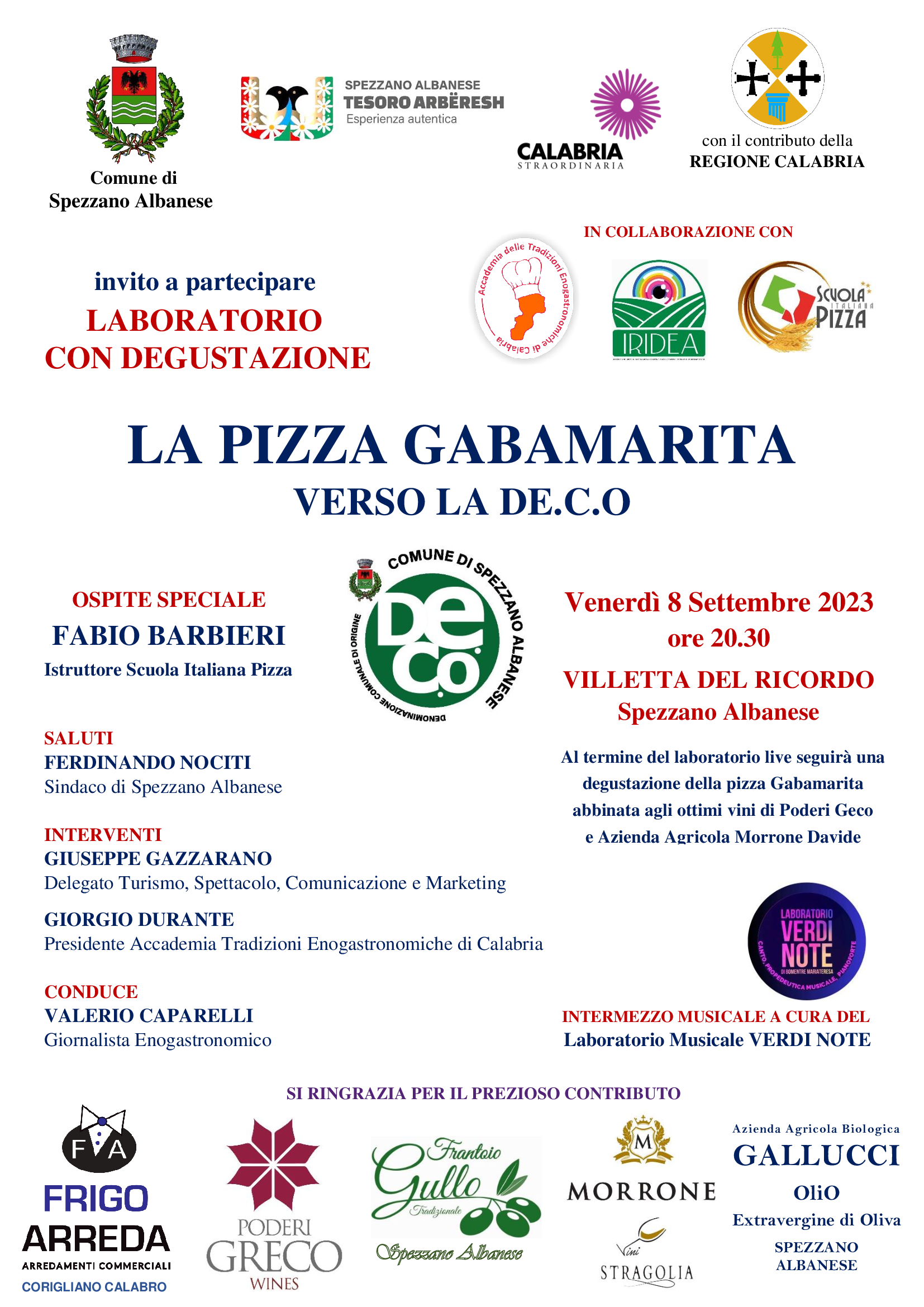 L’evento pubblico del Comune di Spezzano Albanese, patrocinato dalla Regione Calabria attraverso l’azione di promozione turistica Calabria Straordinaria, è organizzato in collaborazione con l’Accademia delle Tradizioni Enogastronomiche di Calabria, l’ITS Iridea e la Scuola Italiana Pizza. Anche quest’anno a coordinare l’incontro promozionale, dal titolo “La Pizza Gabamarita – verso la DE.C.O”, sarà il giornalista enogastronomico Valerio Caparelli.