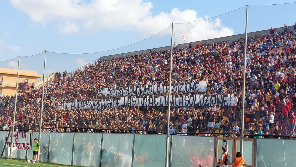 Infine, da evidenziare come gli Ultras della Curva Sud abbiano deciso di non esporre i consueti striscioni dei gruppi organizzati mantenendo soltanto il vessillo già visto a Locri “Identità e Tradizione“, a testimonianza di quanto sia importante per la tifoseria reggina riappropriarsi della propria storia.