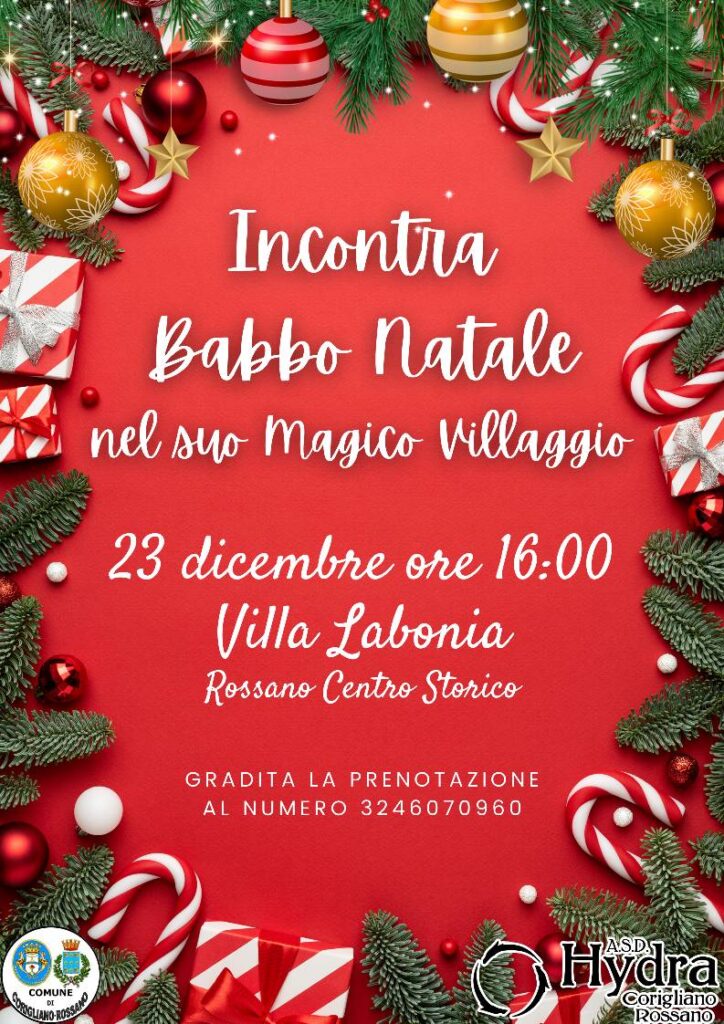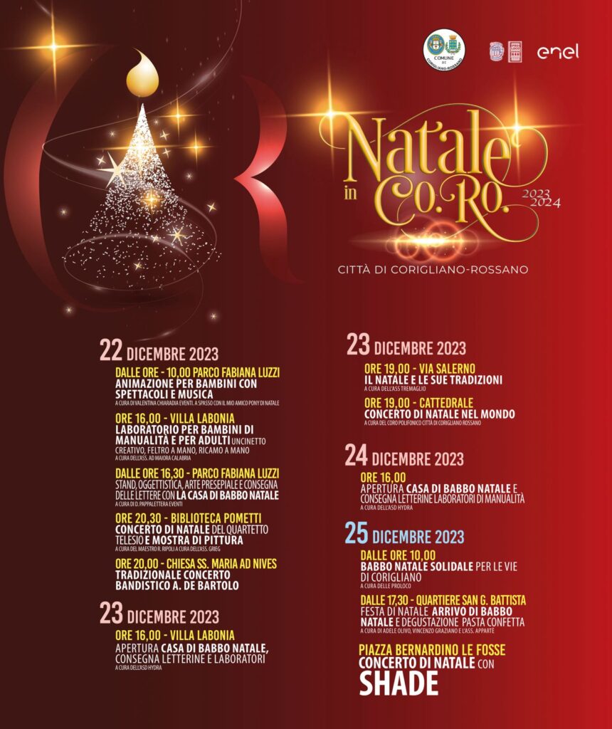 Il 23 dicembre alle ore 16 ci sarà l’apertura della Casa di Babbo Natale e consegna delle letterine più piccoli laboratori di manualità a cura dell’associazione Hydra, nella casa delle associazioni a Villa Labonia. In via Salerno alle 19, a cura dell’associazione Tremaglio, avremo Il Natale e le sue Tradizioni. Grande appuntamento alle 19 in Cattedrale con il Concerto di Natale nel Mondo a cura del coro polifonico città di Corigliano-Rossano.