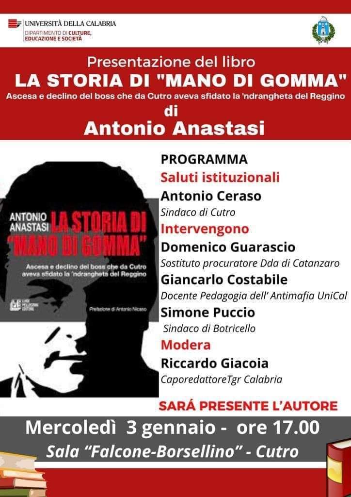 La mafia cutrese e l’imprenditoria criminale al centro della presentazione del libro “La storia di Mano di gomma”, scritto dal giornalista Antonio Anastasi con prefazione di Antonio Nicaso, che si terrà a Cutro mercoledì 3 gennaio, alle ore 17:00, presso la sala comunale “Falcone-Borsellino”. L’iniziativa è organizzata dal corso universitario di Pedagogia dell’Antimafia, attivo presso il Dipartimento di Culture, Educazione e Società dell’Università della Calabria, e dal Comune di Cutro, e sarà aperta dai saluti istituzionali del sindaco Antonio Ceraso.