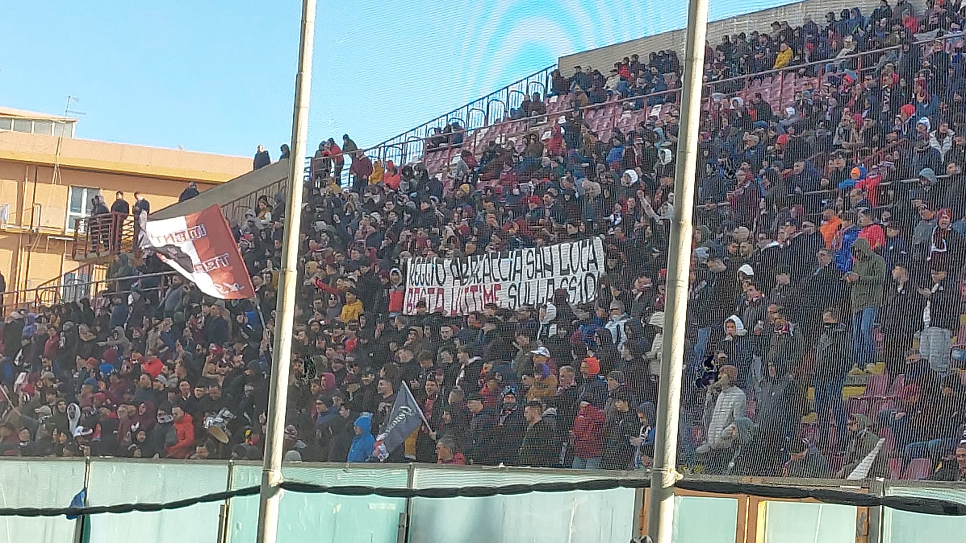 “Reggio abbraccia San Luca, basta vittime sulla SS 106” è il testo dello striscione esposto dal tifo organizzato nel settore caldo. Per la cronaca, il risultato al Granillo è di 0-1 all’intervallo. Il San Luca ha segnato a fine primo tempo con Pelle.