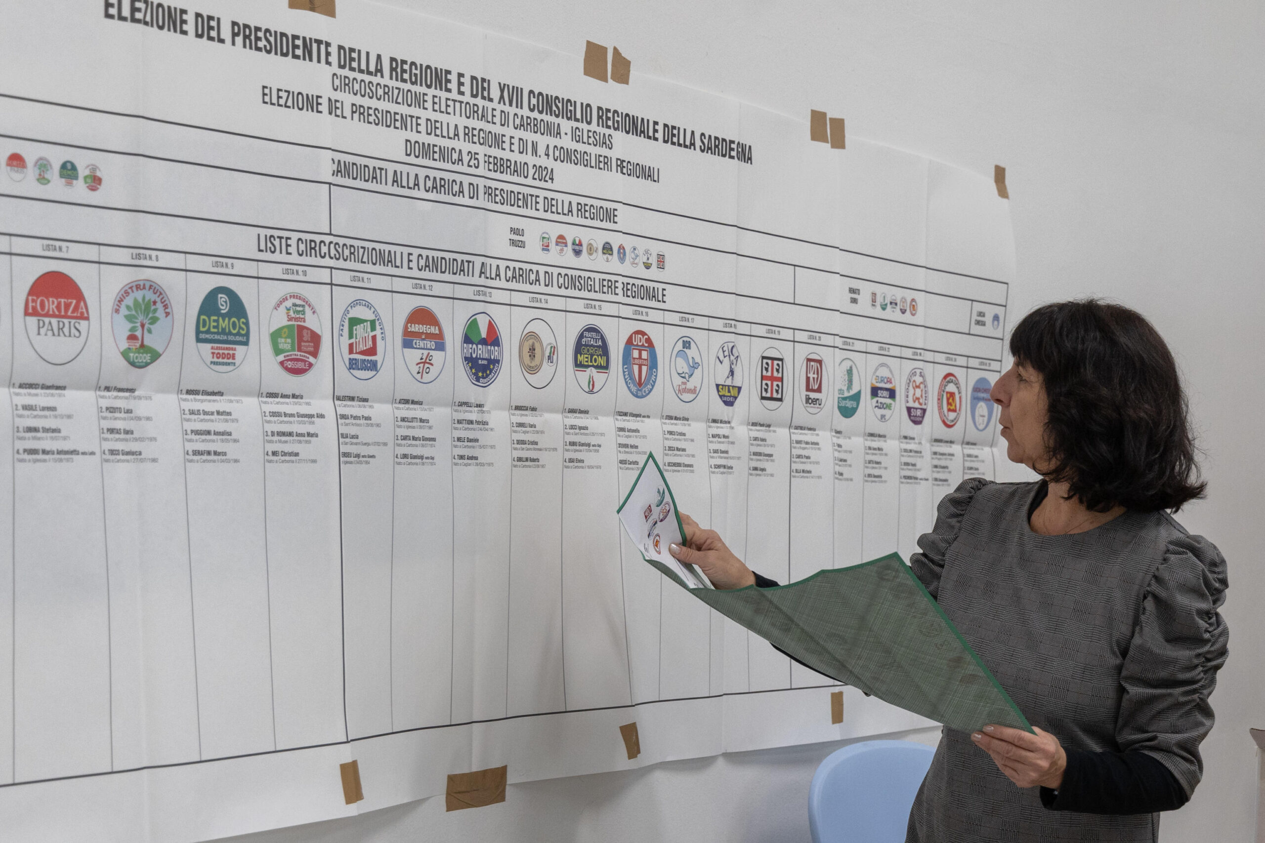 Sono state 25 le liste presentate a supporto dei candidati presidente: dieci per Alessandra Todde (M5S-A Innantis, Pd, Avs, Uniti con Alessandra Todde, Progressisti-La base, Demos, Sinistra Futura, Psi, Orizzonte Comune e Fortza Paris); nove per Paolo Truzzu (Fdi, Lega, Forza Italia, Psd’Az, Riformatori, Udc, Alleanza Sardegna-Pli, Sardegna al centro 20 Venti, Dc di Rotondi).