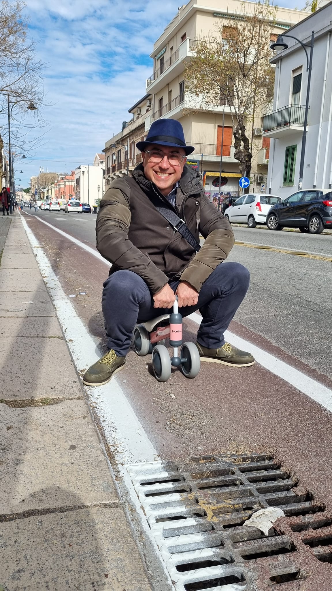 “Saluti dalla pista ciclabile più stretta al mondo. Chissà se il mitico Brumotti di Striscia la notizia verrà per collaudarla“. E’ questo il post ironico apparso questa mattina su Facebook ad opera del noto imprenditore reggino Fabio Bensaja, a corredo di una foto che lo ritrae a bordo di un triciclo da bambini sulla pista ciclabile che sta facendo discutere tutti. Troppo stretta, troppo pericolosa, con le caditoie che ne occupano metà della larghezza.