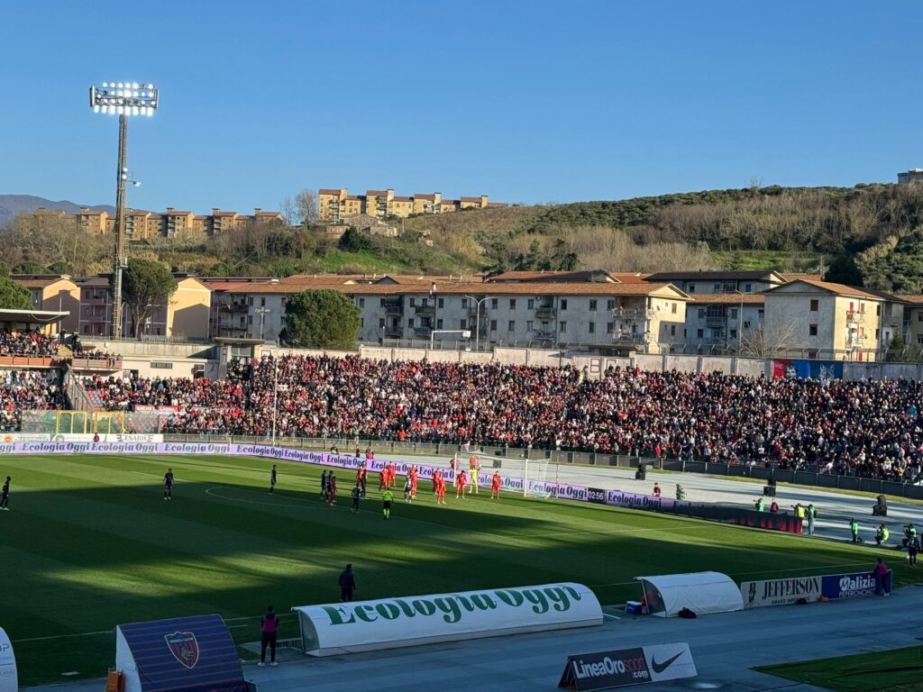 Il primo spettacolo è sugli spalti. Lo abbiamo definito d’altri tempi, come se non si fosse mai fermato rispetto al ’90, anno dell’ultima volta del derby in Serie B. Stadio “San Vito-Marulla” completamente pieno, come non si vedeva da tantissimo.