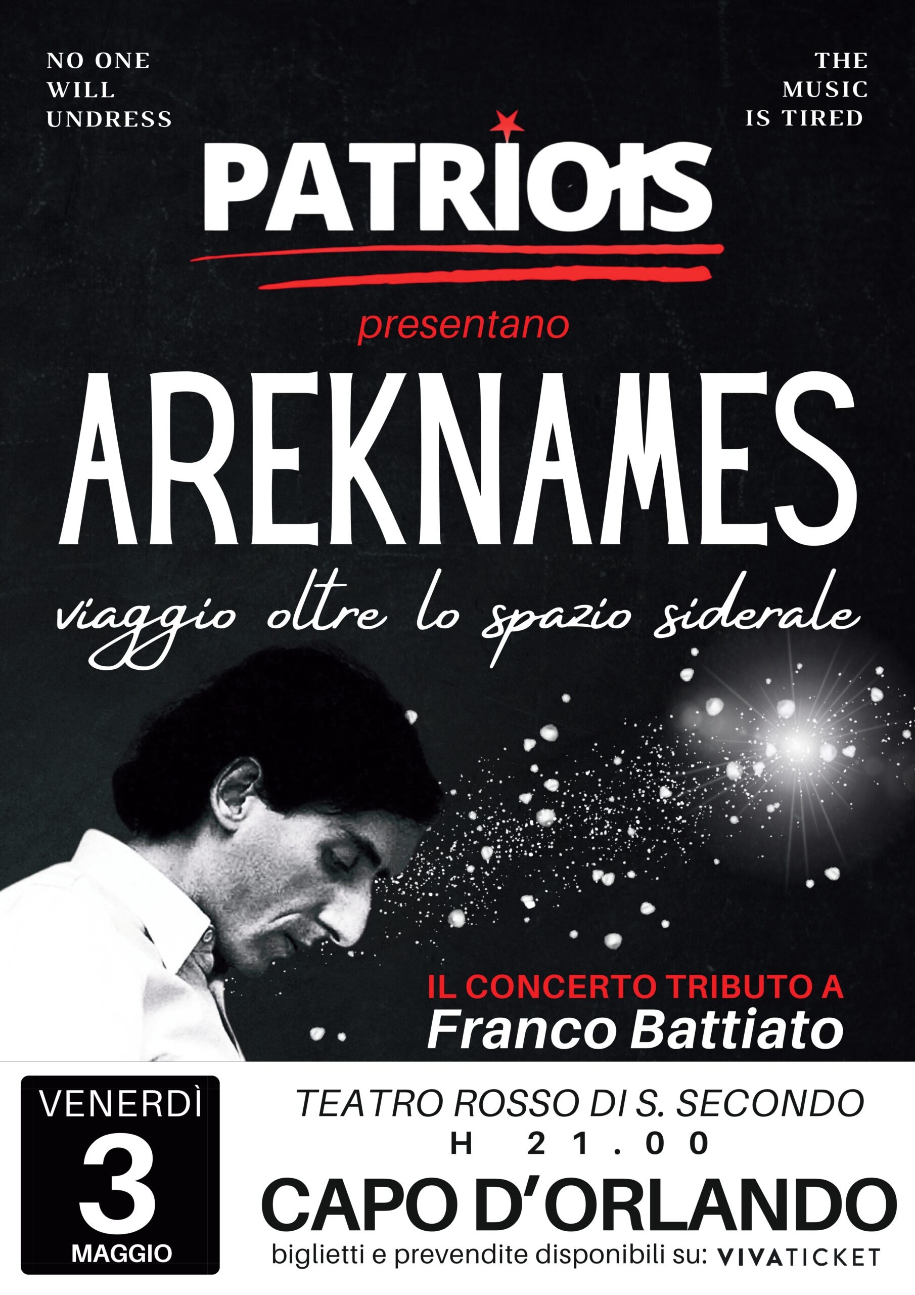 Venerdì 3 maggio alle ore 21:00, al CineTeatro Rosso di San Secondo di Capo d’Orlando, si terrà “Areknames – Viaggio oltre lo spazio siderale“, il concerto tributo al grande Maestro Franco Battiato. L’evento, organizzato in collaborazione con la casa editrice indipendente Rise&Press vedrà sul palcoscenico i Patriots, una tribute band formata da giovani musicisti siciliani, che intende omaggiare la personalità musicale, intellettuale e umana di uno dei più grandi artisti della musica italiana.