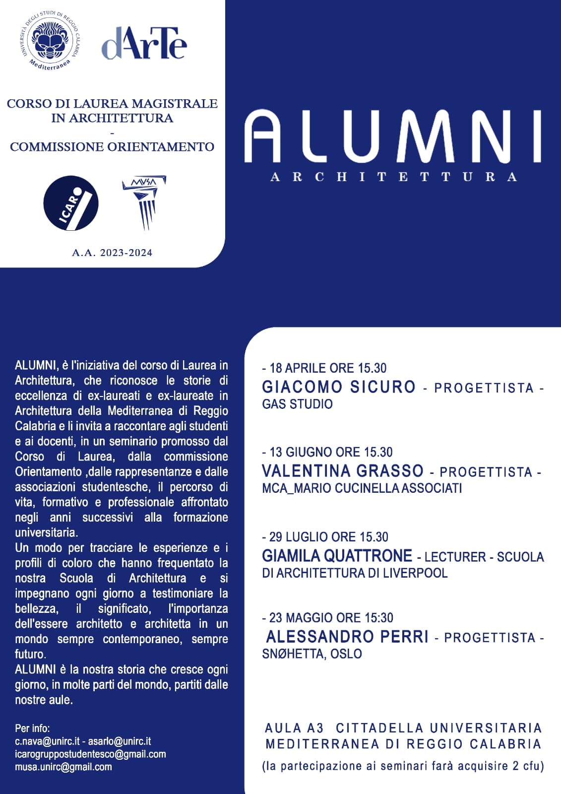 La Coordinatrice del Corso di Laurea Prof.ssa Consuelo Nava e la Delegata all’Orientamento dArTe, Prof.ssa Antonella Sarlo, che hanno progettato e promosso l’iniziativa insieme agli studenti riferiscono così: “Alumni, è l’iniziativa del corso di Laurea in Architettura, che riconosce le storie di eccellenza di ex-laureati e ex-laureate in Architettura della Mediterranea di Reggio Calabria e li invita a raccontare agli studenti e ai docenti, in un seminario promosso dal Corso di Laurea, dalla commissione Orientamento, dalle rappresentanze e dalle associazioni studentesche MUSA e ICARO, il percorso di vita, formativo e professionale affrontato negli anni successivi alla formazione universitaria.
