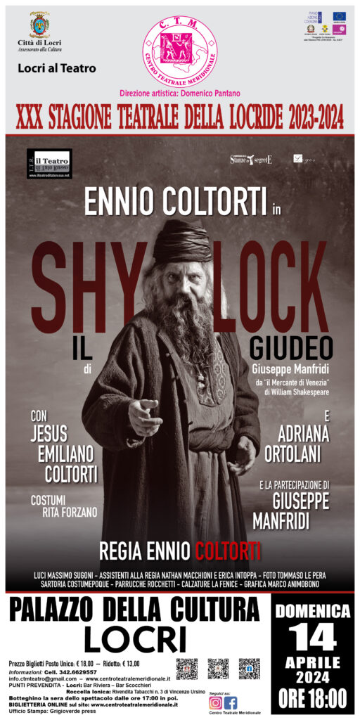 Domenica 14 aprile, in scena Ennio Coltorti in “Shylock il giudeo”, alle ore 18.00, presso il Palazzo della Cultura di Locri, nell’ambito della rassegna “Locri al Teatro”. La pièce è tratta da Il Mercante di Venezia di William Shakespeare, regia dello stesso Ennio Coltorti, con Jesus Emiliano Coltorti, Adriana Ortolani, Giuseppe Manfridi, una produzione T. T. R. Il teatro di Tato Russo Coop Arl.