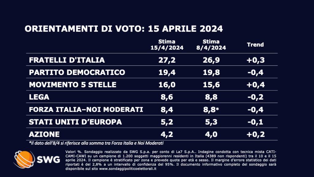 Tutti i partiti politici di maggioranza ed opposizione sono in fibrillazione in vista delle elezioni europee del prossimo 8 e 9 giugno. Nell’ultimo sondaggio di SWG per LA7 porta Fratelli d’Italia al 27,2%, cala il Partito Democratico al 19,4% (-0,4%) ed il Movimento 5 Stelle con 16% (+0,4%).