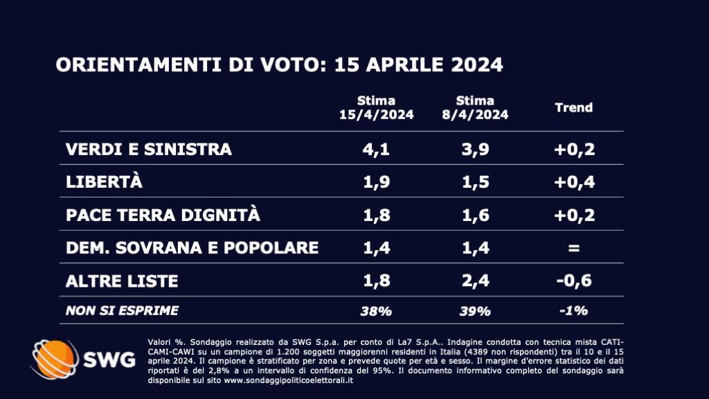Forza Italia si attesterebbe all’8,4%, la Lega di Salvini all’8,6%. Sopra la soglia di sbarramento l’Alleanza Verdi – Sinistra con il 4,1%. Azione sarebbe al 4,2%. Gli Stati Uniti d’Europa, la lista di Renzi e Bonino, si attesta al 5,2%. Pace Terra Dignità di Santoro sarebbe al 1,8%, mentre il Fronte della Libertà di Cateno De Luca all’1,9%.