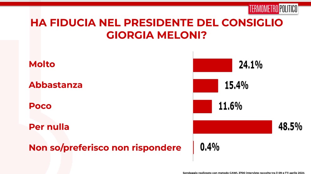 Per quanto riguarda la fiducia in Giorgia Meloni, la premier riprende un po’ di consenso (+0,6%) e si riavvicina al 40% di gradimento. Tra chi ha molta e abbastanza fiducia si arriva al 39,5%. Sfiduciata, invece, dal 60,1% degli italiani.