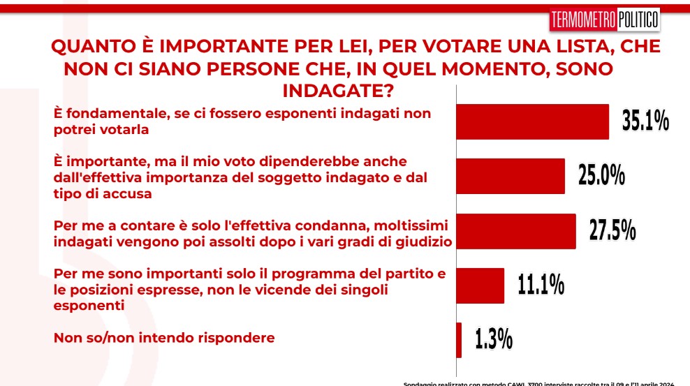 Termometro Politico tasta i cittadini sull’importanza della trasparenza delle liste ed ha chiesto quanto sia importante votare una lista in cui non ci siano indagati. La risposta più gettonata (35,1%) afferma che è “fondamentale“. Un 25% lo ritiene importante ma che, allo stesso tempo, dipenderebbe dall’effettiva importanza del soggetto indagato e dal tipo di accusa. Nel complesso, quindi, 6 italiani su 10 considerano rilevante la “pulizia” di una lista o di un partito. Dall’altro lato, c’è un buon 27,5% garantista: “A contare è solo l’effettiva condanna” in quanto molti indagati risultano poi assolti dopo i vari gradi di giudizio. Infine, solo l’11,1% afferma che sia importante solo il programma del partito e posizioni espresse, e non le vicende dei singoli.