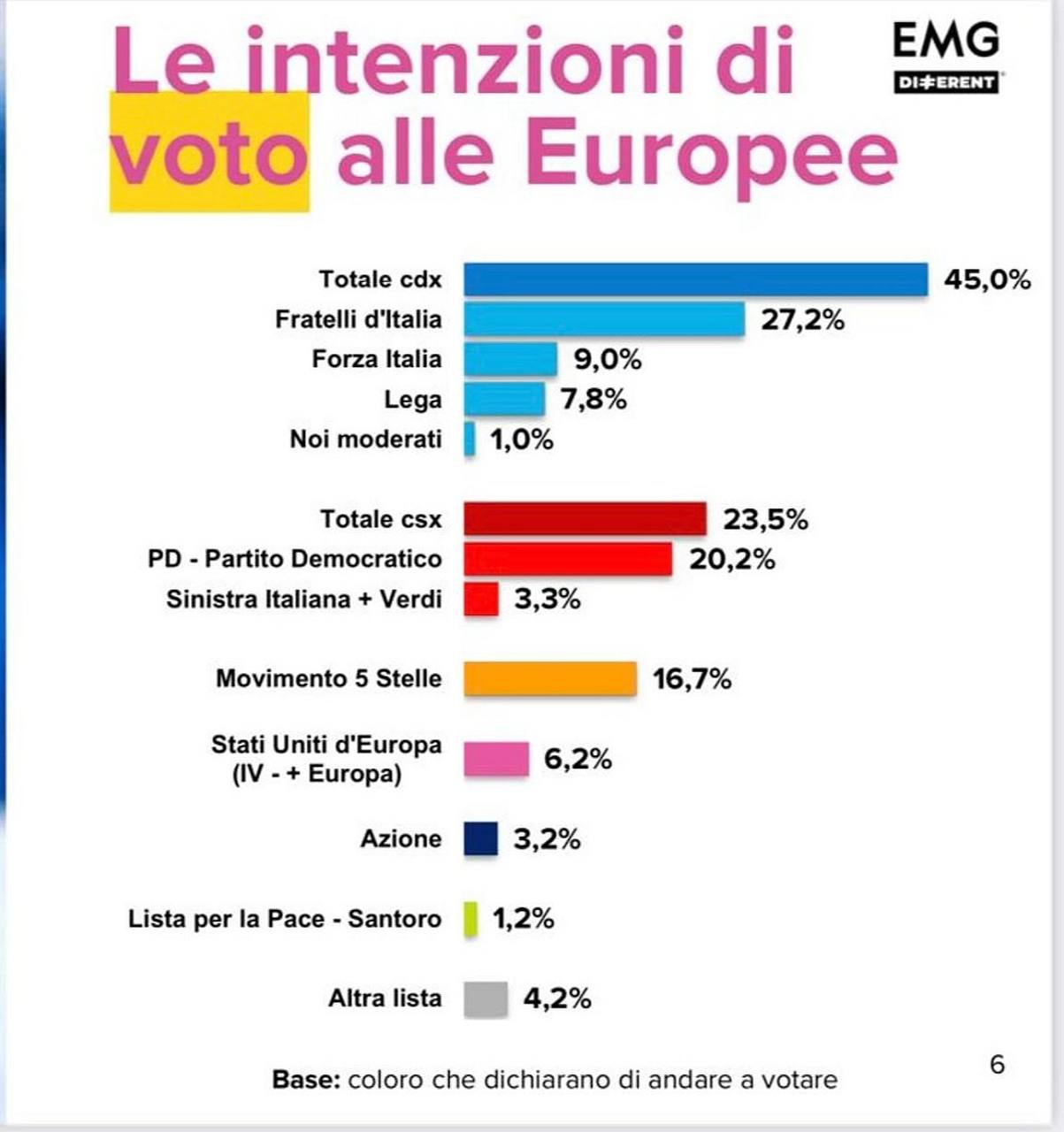 Proliferano i sondaggi politici in vista delle imminenti elezioni europee del prossimo 8 e 9 giugno. Nell’ultimo sondaggio di EMG porta Fratelli d’Italia al 27,2%, Sale il Partito Democratico al 20,2%. Il Movimento 5 Stelle si assesta al 16,7%.