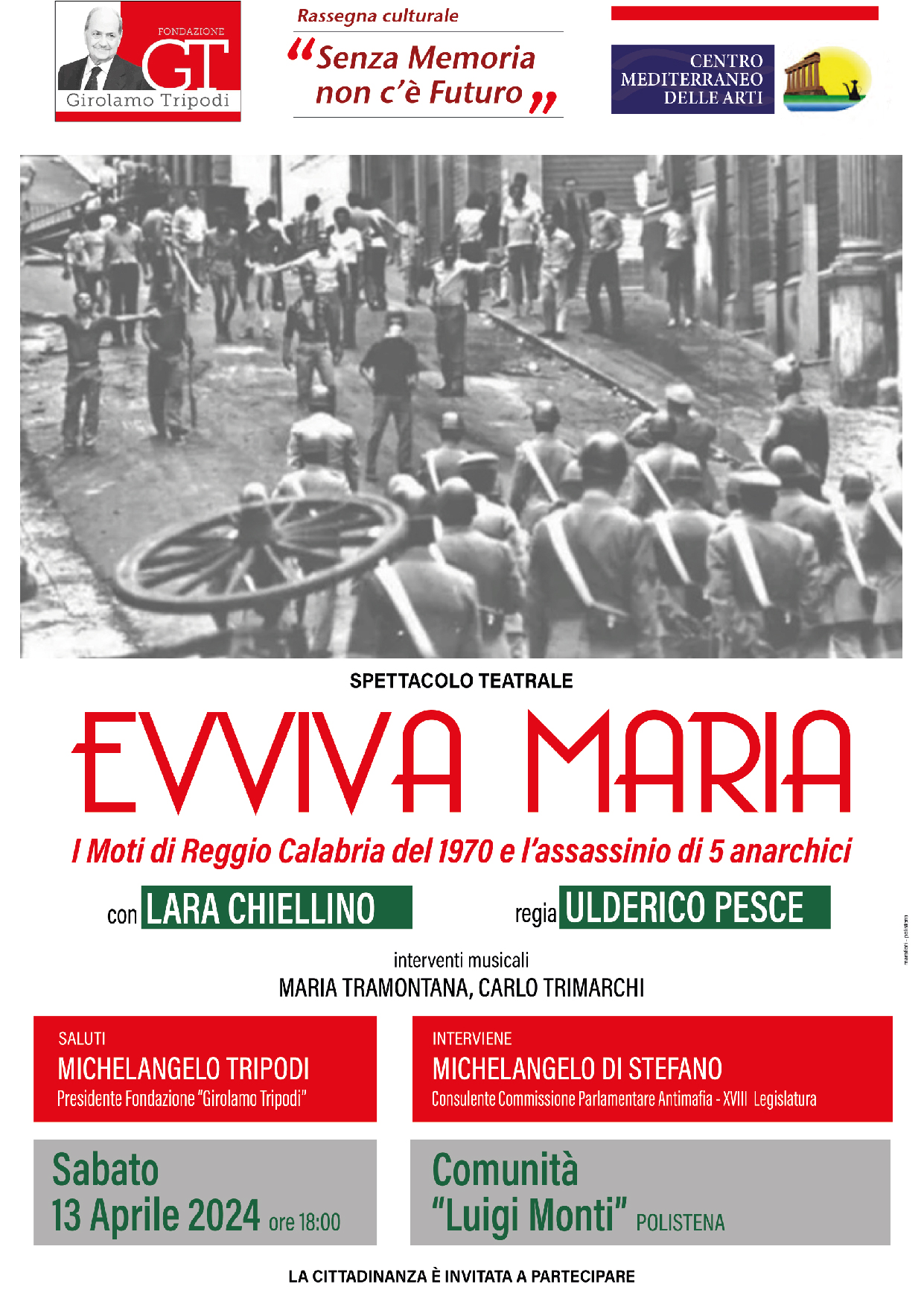 A circa 54 anni da quelle vicende, Evviva Maria ci offre un approfondimento di verità sui moti di Reggio Calabria, partendo dalla storia di due innamorati vissuti a Reggio nel 1970 e affrontando una delle pagine più misteriose e drammatiche dell’Italia repubblicana.