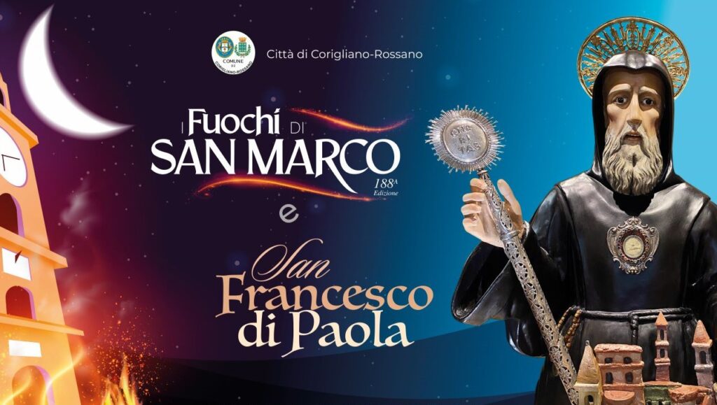 Le iniziative per i Fuochi di San Marco partiranno da domenica 21 per concludersi mercoledì 24 aprile. La festa del 25 aprile di Corigliano nasce per ringraziare il Patrono, San Francesco di Paola, per averla salvata dalla catastrofe del terribile terremoto del 1836. In origine –