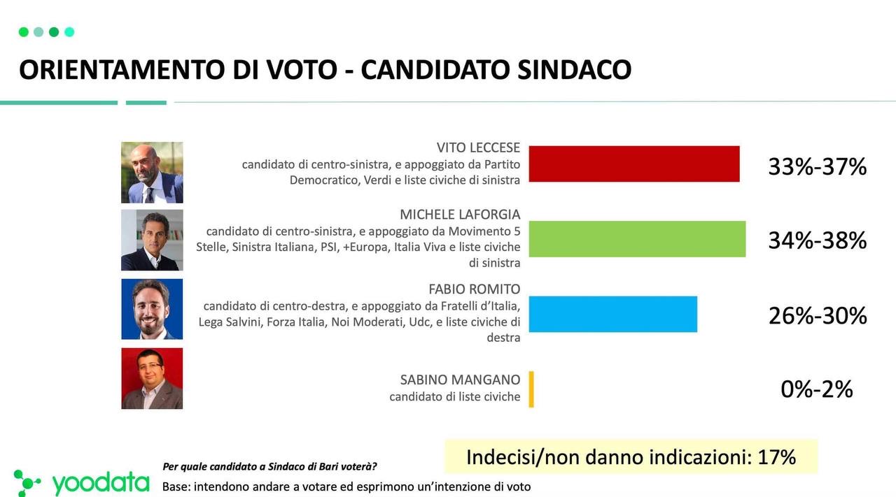 Dai primi sondaggi di Yoodata sarebbero avanti i due candidati di centrosinistra con Michele Laforgia e Vito Leccese, col primo in vantaggio di appena un punto. Staccato il candidato di Centrodestra Fabio Romito.