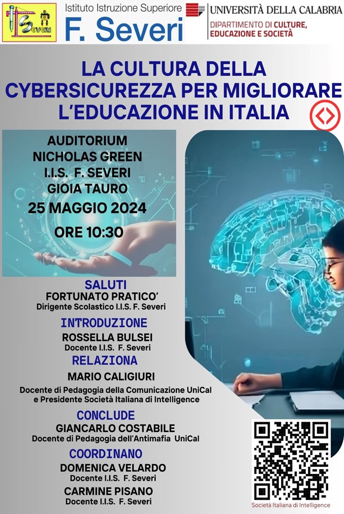 Si chiude il secondo ciclo seminariale di “Cittadinanza e Costituzione” promosso dall’Istituto Severi di Gioia Tauro in collaborazione con il corso universitario di Pedagogia dell’Antimafia attivo presso il Dipartimento di Culture, Educazione e Società dell’Università della Calabria. Il 25 Maggio, alle 10.30, nell’Auditorium Nicholas Green della scuola, si discuterà di sicurezza informatica ed educazione con Mario Caligiuri, docente di Pedagogia della Comunicazioni all’UniCal e presidente della Società Italiana di Intelligence.