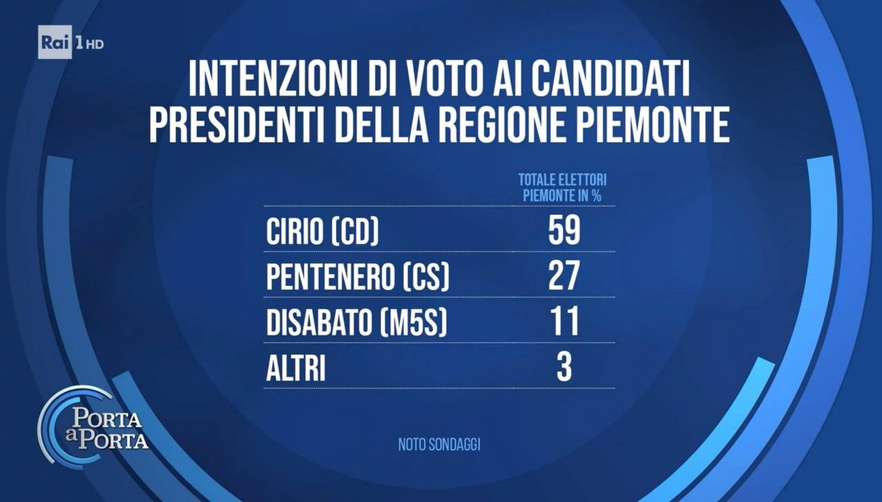 Prosegue la campagna elettorale in vista delle elezioni regionali in Piemonte che si terranno il prossimo 8 e 9 giugno in concomitanza con le elezioni europee. Le intenzioni di voto espresse nel sondaggio di Noto per Porta a Porta, evidenziano una netta preferenza per il presidente uscente, Alberto Cirio (59%) del centrodestra, che sarebbe avanti di oltre 30 punti punti rispetto a Gianna Pentenero (27%) del centrosinistra.