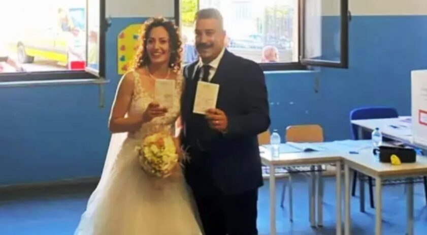 Giovanni e Giulia si sono sposati ieri, sabato 8 giugno, nello stesso giorno di Europee e Comunali. Prima il “sì” in Chiesa, alle ore 16, poi dritti al seggio elettorale con gli abiti nuziali, prima della grande festa. Che intanto era iniziata al seggio, vista la band che ha accompagnato i presenti e lo stupore di Presidente di seggio e scrutatori.