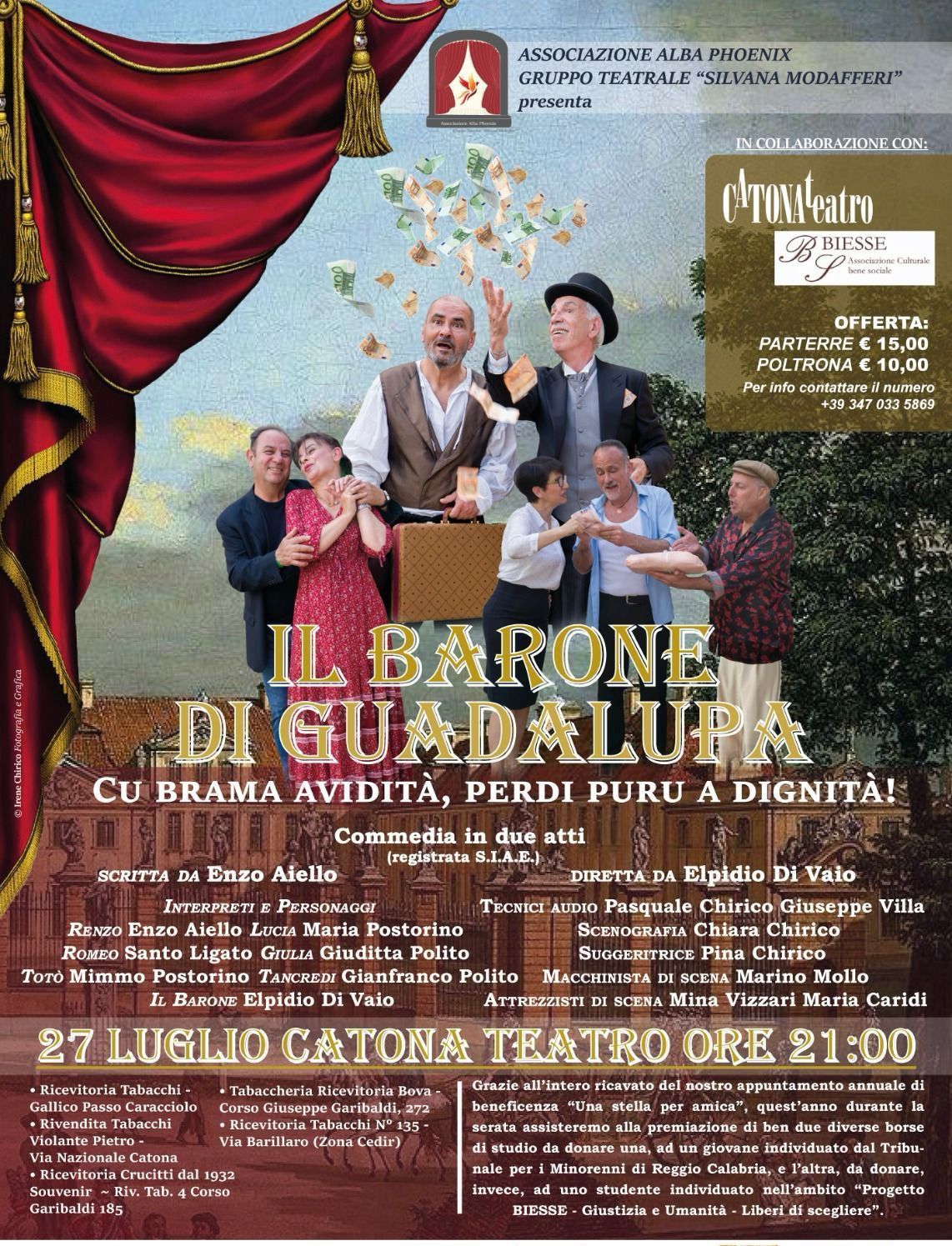 L’Associazione Alba Phoenix Gruppo Teatrale “Silvana Modafferi” presenta “Il Barone di Guadalupa, cu brama avidità perdi puru a dignità”. Si tratta di una commedia in due atti che si terrà a Catona Teatro il 27 luglio alle ore 21.