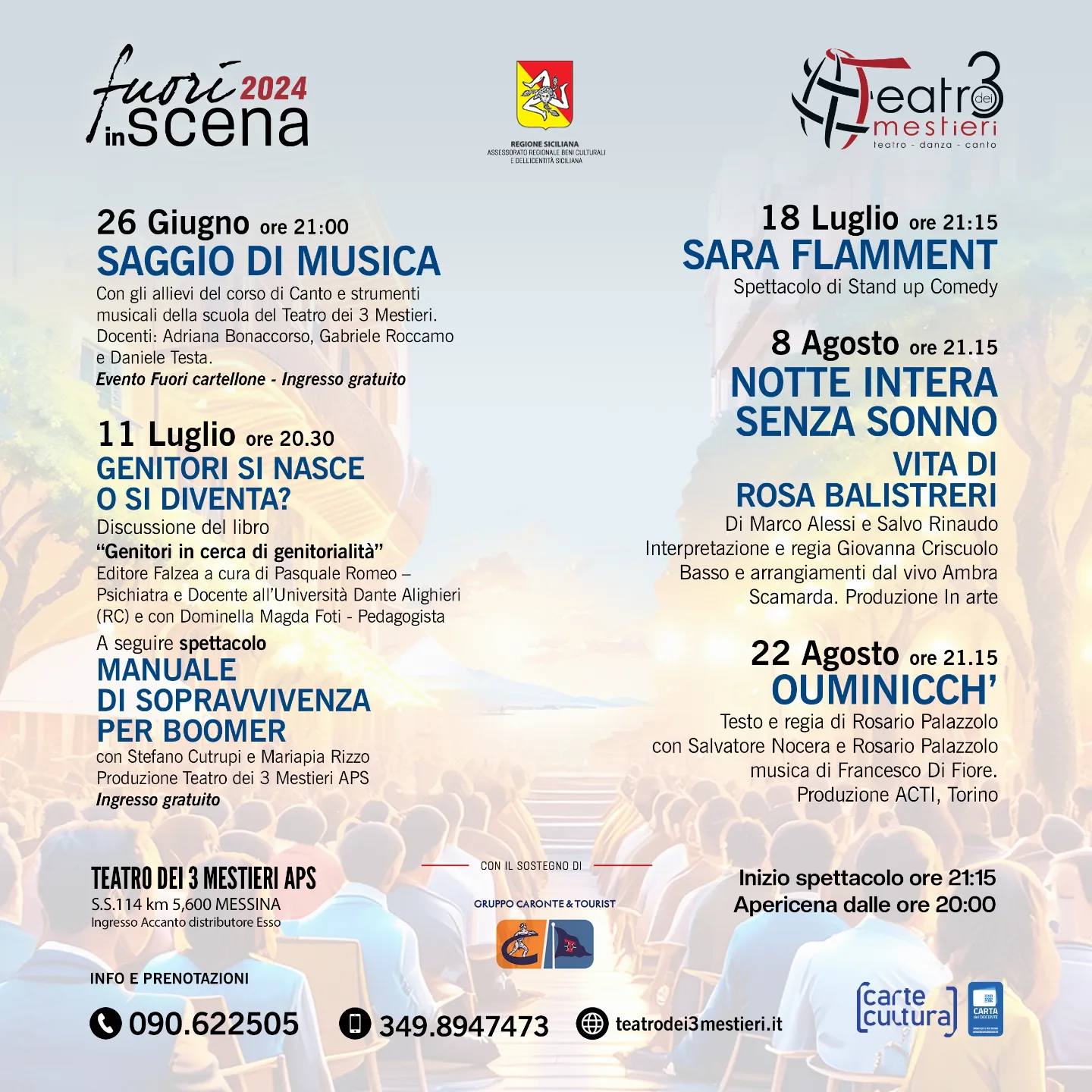 Il Teatro dei 3 Mestieri di Messina annuncia la nuova stagione estiva “”Fuori in Scena”, ospitata nel loro spazio all’aperto. Saranno quattro gli eventi in programma, dall’11 luglio al 22 agosto. Ad inaugurare il cartellone sarà giovedì 11 luglio alle 20.30 la presentazione del libro “Genitori in cerca di genitorialità” (Editore Falzea) a cura di Pasquale Romeo, Psichiatra e Docente all’Università Dante Alighieri (RC), con la Pedagogista Dominella Magda Foti. A seguire spettacolo Manuale di sopravvivenza Per boomer con protagonisti Stefano Cutrupi e Mariapia Rizzo (Produzione Teatro dei 3 Mestieri APS). Ingresso gratuito.