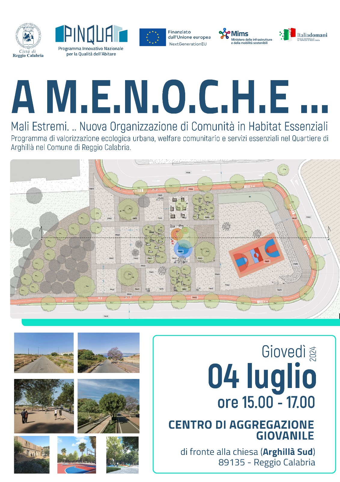 Alla presenza dell’Assessore Elisa Zoccali e dei tecnici impegnati nella redazione dell’iter progettuale, saranno illustrati i dettagli dell’intervento denominato “A.M.E.N.O.C.H.E…”, “A Mali Estremi… Nuova Organizzazione di Comunità in Habitat Essenziali”. Programma di valorizzazione ecologica urbana, welfare comunitario e servizi essenziali nel Quartiere di Arghillà nel Comune di Reggio Calabria.