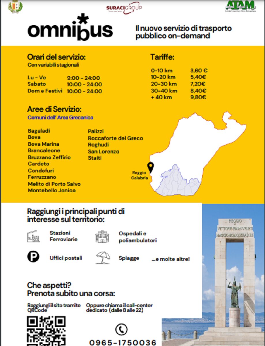 “Omnibus” è pronto a partire. Il nuovo servizio di mobilità sociale a chiamata, promosso dalla Città Metropolitana di Reggio Calabria in collaborazione con Atam, sarà attivo da venerdì 2 agosto con una prima fase sperimentale che coinvolgerà le aree territoriali della zona Grecanica. L’intervento, inserito nell’ambito del progetto “Aspromonte in città”, è finanziato con i fondi del Pnrr per circa 2,5 milioni di euro e rappresenta una valida alternativa all’uso del mezzo privato, andando incontro alle esigenze dei cittadini delle aree a domanda debole che verranno, così, riconnessi con il resto dell’area metropolitana. Si tratta in ogni caso di un nuovo servizio attivato per il momento in via sperimentale nell’area grecanica, nelle zone più penalizzate dal punto di vista dei collegamenti trasportistici. Proprio questo primo avvio in forma sperimentale consentirà di evidenziare eventuali migliorativi e suggerimenti utili a calibrare modalità e percorsi per l’utilizzo dei mezzi a chiamata.