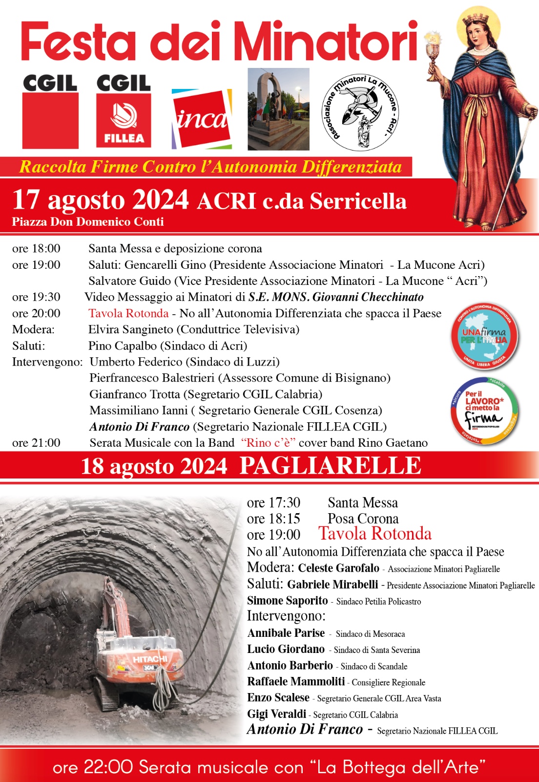La Fillea Cgil Calabria, anche quest’anno, ha organizzato “La Festa dei Minatori”, un appuntamento che vuole essere “un momento di riflessione sia sotto l’aspetto sociale che quello lavorativo dei minatori” e che in quest’edizione sarà caratterizzata da due tavole rotonde sull’Autonomia Differenziata, una legge che spacca l’Italia. Quest’anno la Festa dei Minatori, alla presenza dei vertici della Fillea Nazionale e Regionale, prenderà il via il 17 agosto in piazza don Domenico Conti in contrada “Serricella” del comune di Acri.