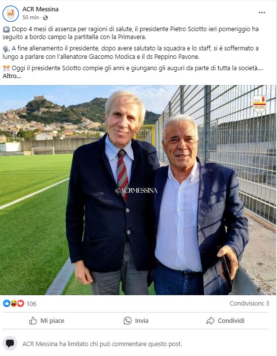 Però è tutto a posto, sono tutti contenti e felici. “Dopo 4 mesi di assenza per ragioni di salute, il presidente Pietro Sciotto ieri pomeriggio ha seguito a bordo campo la partitella con la Primavera. A fine allenamento il presidente, dopo avere salutato la squadra e lo staff, si è soffermato a lungo a parlare con l’allenatore Giacomo Modica e il ds Peppino Pavone. Oggi il presidente Sciotto compie gli anni e giungano gli auguri da parte di tutta la società”, ha scritto questa mattina il club, postando una foto di Sciotto. Con una società normale, in un momento normale, sarebbe pieno di commenti al post con tanto di auguri al Presidente. E invece quei commenti non ci sono, perché il club li ha limitati. I motivi? Abbastanza chiari, c’è poco da spiegare.