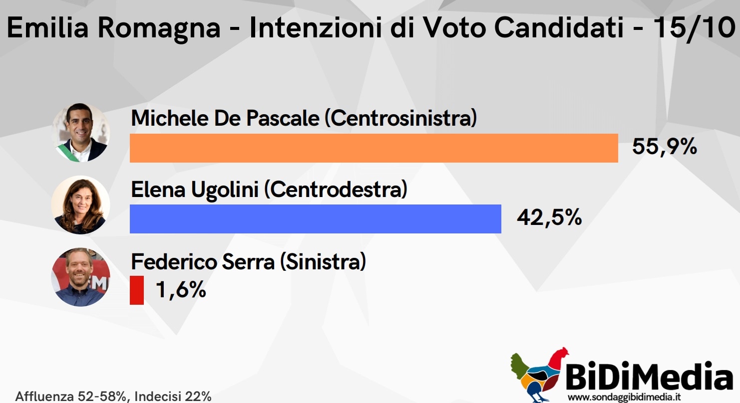 Il sondaggio realizzato da BiDiMedia per il gruppo editoriale Citynews, sulle elezioni regionali in Emilia Romagna, evidenzia un vantaggio netto di Michele De Pascale del centrosinistra su Elena Ugolini del centrodestra. Le urne si apriranno il prossimo 17 e 18 novembre. StrettoWeb seguirà tutte le fasi della campagna elettorale e degli spogli.