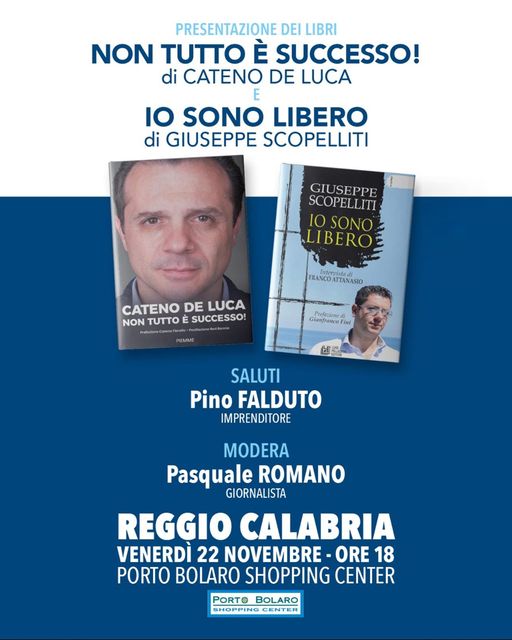 Oltre un mese dopo la doppia presentazione a Taormina, Giuseppe Scopelliti e Cateno De Luca tornano a presentare insieme i propri libri, ma per la prima volta a Reggio Calabria. I testi in questione sono “Non tutto è successo” del Sindaco di Messina e “Io sono libero” dell’ex Governatore calabrese e primo cittadino di Reggio.