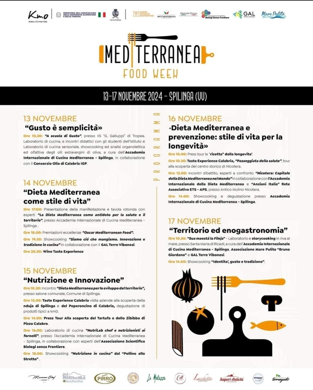 Cinque giorni alla scoperta delle radici della Dieta Mediterranea. Dove? A Spilinga. Dal 13 al 17 novembre andrà in scena il “Mediterranea Food Week”, che valorizza e promuove attività di informazione e divulgazione sulle produzioni agroalimentari calabresi e l’educazione alimentare.