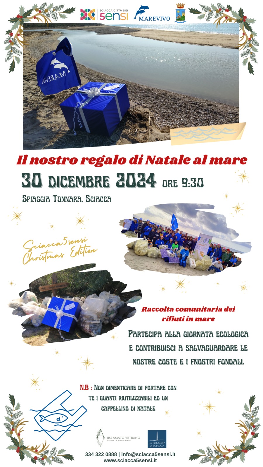 Torna l’iniziativa denominata “Il nostro regalo di Natale al mare” , la raccolta comunitaria di rifiuti in spiaggia organizzata puntualmente da qualche anno dalla delegazione siciliana di Marevivo e dal Museo Diffuso dei 5 Sensi nell’ambito della programmazione degli eventi natalizi. L’iniziativa si svolgerà il 30 Dicembre, dalle 9:30 alle 12:30, presso la spiaggia della Tonnara di Sciacca e consisterà in un’azione di pulizia della spiaggia quale simbolico “regalo” all’ambiente e al mare per sensibilizzare sull’importanza di prendersi cura ogni giorno del nostro Pianeta.