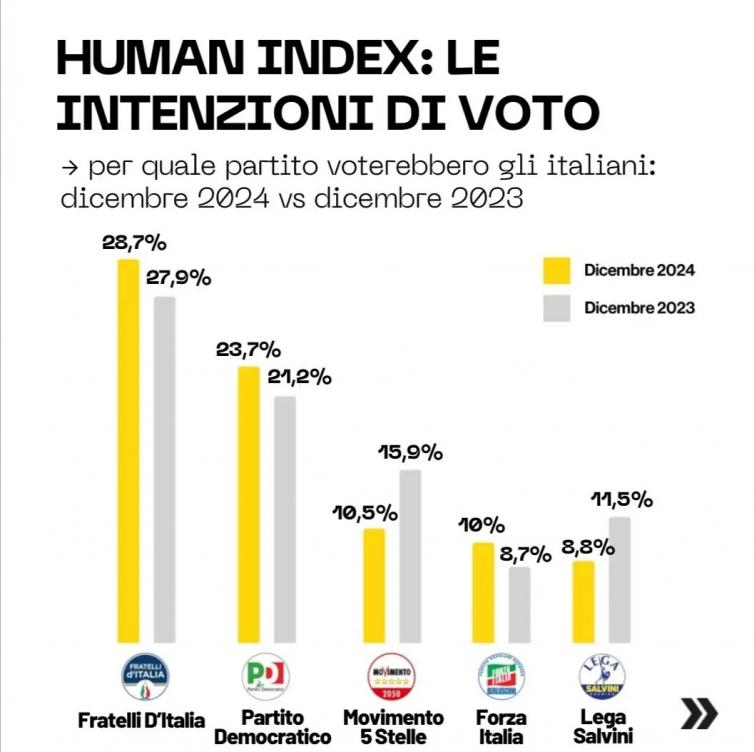 I sondaggi politici, nella giornata di Santo Stefano, gratificano Fratelli d’Italia (+0,8% rispetto al dicembre 2023). Cresce Forza Italia (+1,3%) cala la Lega che si attesta all’8,8%. È quanto emerge dalle intenzioni di voto di Vis Factor/EMG. Per quanto riguarda le opposizioni, sale il Partito Democratico mentre scende il Movimento 5 Stelle (-5,4% rispetto al dicembre 2023).