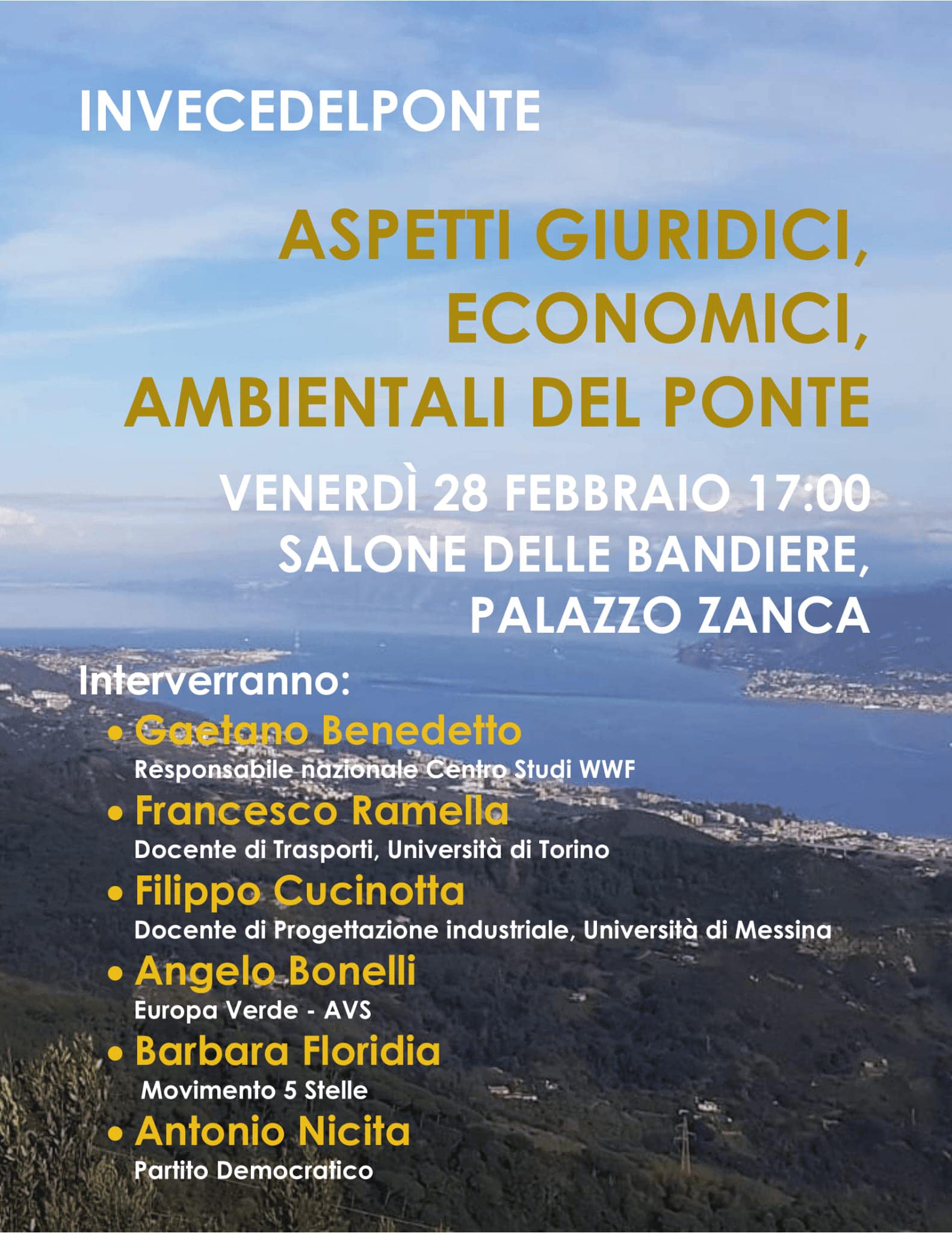 A proposito di convegni, domani – venerdì 28 febbraio – sarà il turno dell’incontro dal titolo “Aspetti giuridici, economici, ambientali del Ponte”, in programma a Messina, presso Palazzo Zanca, alle ore 17. Interverranno le solite personalità dei soliti movimenti, comitati e associazioni no Ponte. L’evento, infatti, è organizzato dal movimento “Invece del Ponte”. Si segnalano, tra gli altri, gli interventi di Angelo Bonelli (Europa Verde – AVS) e di Barbara Floridia (Movimento Cinque Stelle). Non mancano PD (Antonio Nicita) e WWF. Di seguito la locandina con il programma completo.