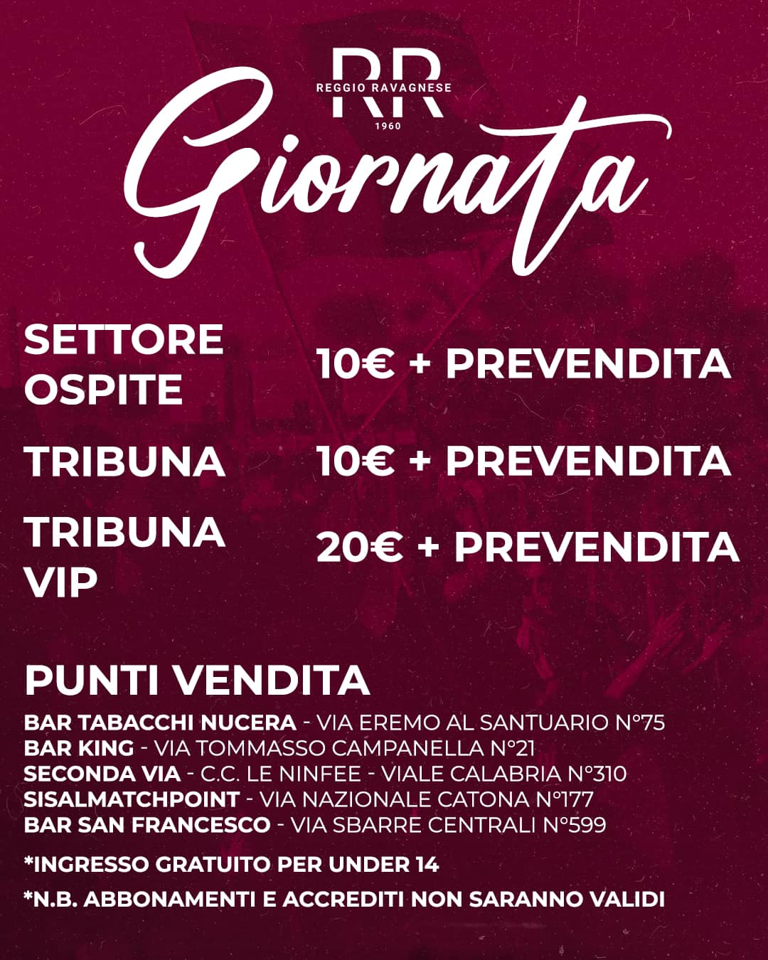 Aperta la prevendita dei biglietti per la partita ReggioRavagnese-Vigor Lamezia, che andrà in scena Domenica 23 Marzo alle ore 15:00 all’Oreste Granillo di Reggio Calabria. La società per l’occasione indice la Giornata ReggioRavagnese. Non saranno ammessi per l’occasione nessun accredito e/o abbonamento. Ingresso gratuito per Under 14. I biglietti potranno essere acquistati presso le seguenti attività: