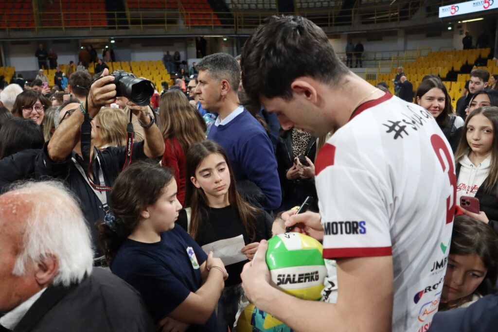 Al termine della gara l’abbraccio con tutti i tifosi e la solita girandola di selfie e autografi a cui i ragazzi della Domotek non si sottraggono mai.