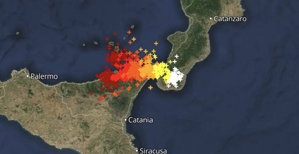 Ecco, intanto, le immagini satellitari con il temporale in movimento tra Sicilia e Calabria: