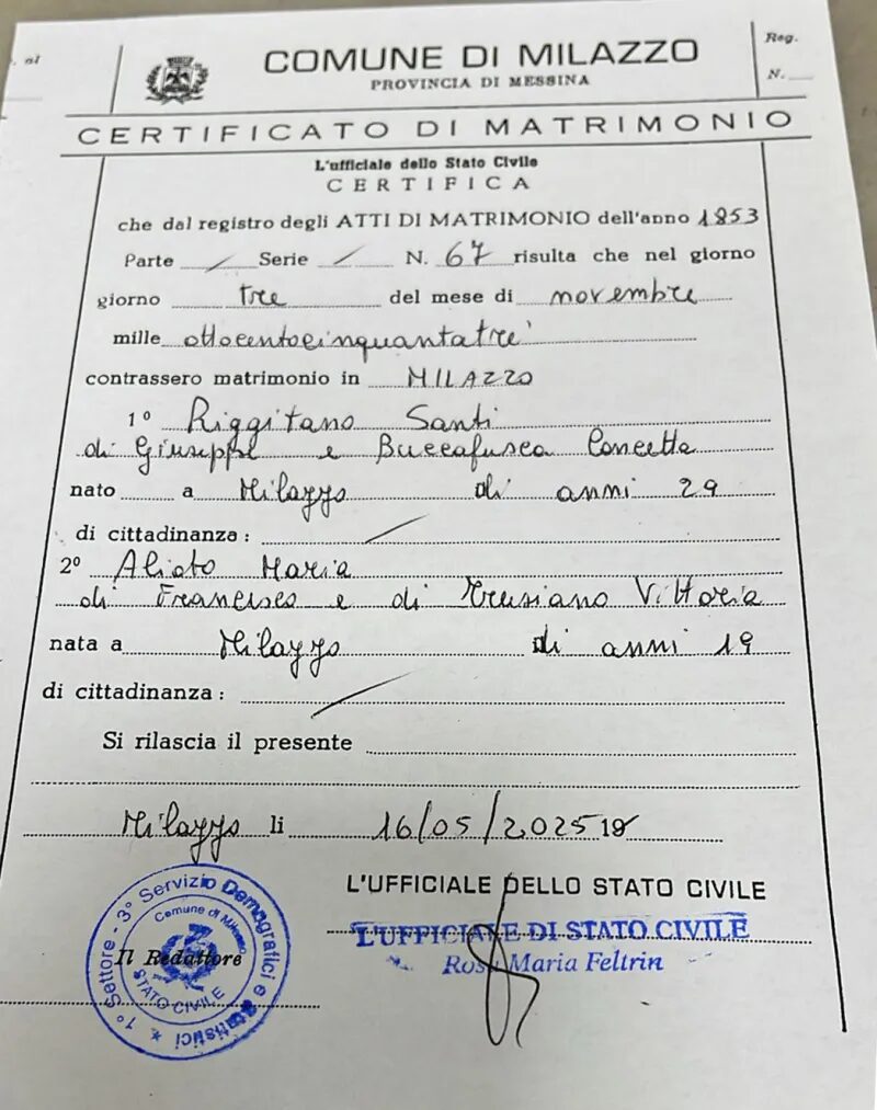 Salvatore Giovanni Riggitano era nato a Milazzo il 24 giugno 1876 nella casa in via Ottaviana; era figlio di Riggitano Santi (usciere di anni 50) e di Alioto Maria, di 42 anni, uniti in matrimonio nel 1853. Il nonno di Papa Prevost, infatti, emigrò in America nel 1904 dove raggiunse a Quincy, nello stato dell’Illinois, la sorella Rosa sbarcata a New York nel giugno del 1903 con la nave Lombardia salpata dal porto di Napoli (come risulta dai dati di Ellis Island).