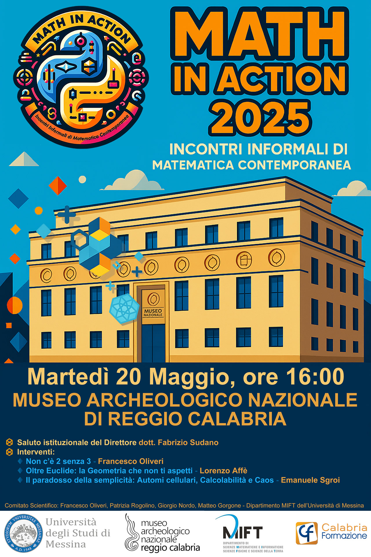 Il grande interesse per la matematica e la straordinaria risposta del pubblico hanno decretato il successo dell’edizione 2025 di Math in Action, l’evento di divulgazione scientifica promosso dal Dipartimento MIFT dell’Università di Messina, dal Museo Archeologico Nazionale di Reggio Calabria e dall’associazione Calabria Formazione. A pochi giorni dall’evento, in programma martedì 20 maggio 2025 alle ore 16:00, i posti disponibili sulla piattaforma di registrazione Eventbrite sono andati completamente esauriti, raggiungendo il numero massimo consentito di 90 partecipanti, per ragioni di sicurezza legate alla capienza della sala conferenze sulla terrazza panoramica del Museo.